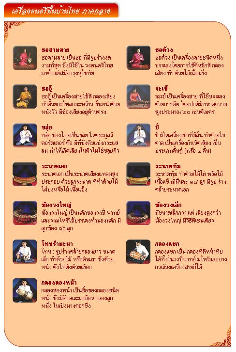 ซอสามสาย ซออู้ ซอด้วง จะเข้ ขลุ่ย ปี่ ระนาดเอก ระนาดทุ้ม ฆ้อมวงใหญ่ ฆ้อมวงเล็ก กลองแขก...อ่านต่อ